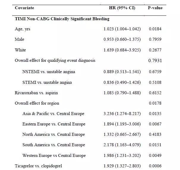 研究结果表明,与阿司匹林联合P2Y12 受体抑制剂相比,利伐沙班联合P2Y12 受体抑制剂不增加出血风险,缺血性终点发生率相似。值得注意的是,本研究还通过年龄、性别、种族、地区和研究治疗校正的多因素回归模型发现,替格瑞洛组患者相较于氯吡格雷出血发生率显著增加(HR=1.929, 95%CI:1.327~2.803, P=0.0006)(表2),而且不同地区是出血风险的重要的影响因素(P=0.0178)。其中,亚太地区人群的出血风险在所有研究人群中最高,近乎是中欧地区出血风险的3倍(HR=3.236, 95%CI:1.274~8.217, P=0.0135)。而替格瑞洛与氯吡格雷不同地区人群的缺血性终点事件的发生率类似。