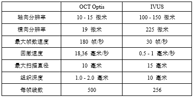 采用宽频激光光源,独有的Fourier电脑分析系统,扫描速度最大高达36毫米/秒,扫描长度达到75毫米,最大帧数速度为180帧/秒,每帧线数500线,扫描直径10毫米,轴向分辨率高达10微米,不需要阻断血流。FFR+OCT一体机,具有实时3D功能,可以即时重建血管3D模型,对于评估分支血管开口有很大的临床指导价值。有管腔自动识别和测量工具,自动选择支架尺寸,简便准确测量管腔。OCT Optis是目前唯一可以在中国销售的最新最高配置OCT系统,具备高清晰度,高扫描成像速度,操作简便,大大提高了手术速度和安全性,是目前清晰度最高的血管内成像技术。与血管内超声(Intravascular Ultrasound, IVUS)对比: