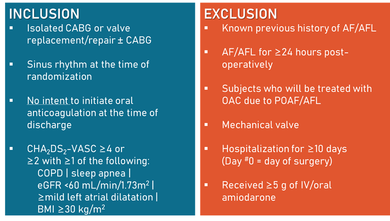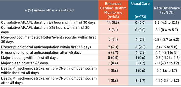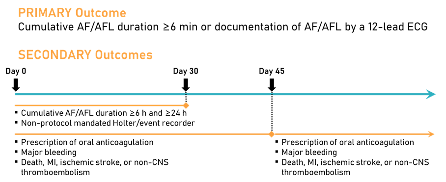 该试验的主要终点是术后30天内AF/AFL,定义为累积AF/AFL持续时间≥6分钟,或通过12导联ECG记录到AF/AFL。次要终点包括:(1)术后30天内:AF/AFL持续≥6h或24h、接受非研究安排的动态心电图监测和/或心律监测设备;(2)术后45天内或术后第46天至最后随访日之间:口服抗凝处方药、发生大出血事件、全因死亡、心肌梗死、缺血性卒中或非中枢神经系统栓塞(图5)。