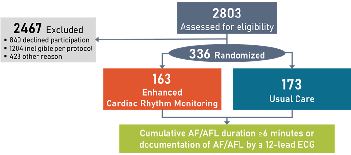 SEARCH-AF研究是一项开放标签、双臂随机对照试验,旨在评估一种新的诊断工具,用于监测无AF病史且存在高卒中风险的心脏手术后患者术后早期和亚急性期的AF或心房扑动(atrial flutter, AFL)。其中,心脏手术包括CABG、瓣膜置换/修复术或瓣膜置换/修复术联合CABG。卒中风险通过CHA₂DS₂-VASc评分来进行评估(CHA₂DS₂-VASc ≥ 4或CHA₂DS₂-VASc ≥ 2并有AF/AFL危险因素)(本研究的纳入和排除标准见图1)。本研究预计入组396名参与者,而由于受到COVID-19疫情的影响,最终只有336名参与者入组(图2)。