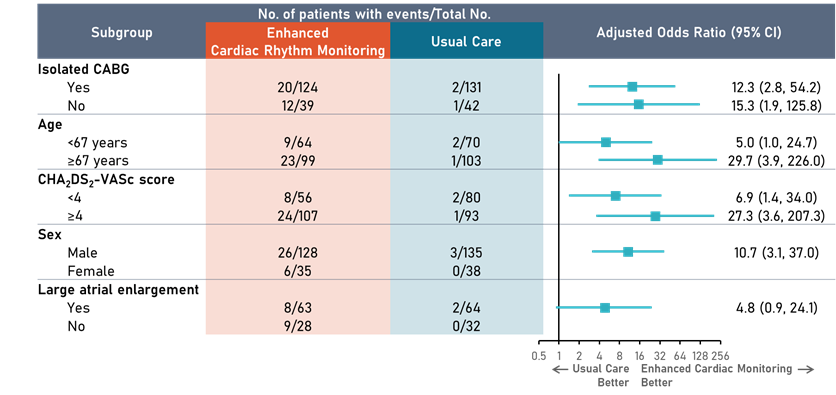 4. 在预先指定的亚组分析中(是否只进行单纯CABG、年龄<67岁或≥67岁、CHA₂DS₂-VASc评分<4或≥4、是否为男性和是否存在左心房增大),干预组在所有的亚组中的POAF检出率都显著高于对照组,同时,在≥67岁、CHA₂DS₂-VASc评分≥4、女性和不合并左心房增大的患者亚组中,干预组的POAF检出率均高于对照组(图10)。