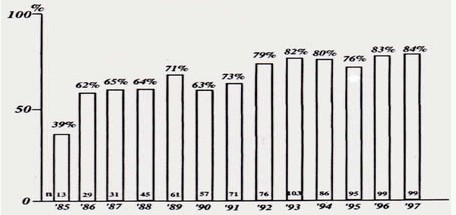 图1 CTO病变首次PTCA治疗成功率年度变化图例
