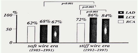 随着治疗例数和经验的增加,CTO病变PTCA成功率呈一学习曲线,另外成功率在1992年似乎是分界点,这可能是由于我们坚持积极使用硬导丝代替软导丝的结果,之后成功率没有显著降低目前所有CTO病变再血管化治疗成功率在80%左右.