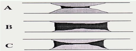 慢性完全闭塞病变组织类型大致有两种:一种主要是由高度机化的狭窄组织最终导致闭塞(图3 :A);另一种是机化的血栓组织和轻度狭窄组织,就象在大多数急性心肌梗死中的阻塞病变那样(图3:B)。很明显这两种病变类型对导丝通过病变时的反应不同。许多基于严重狭窄的慢性闭塞病变硬度有很大差异,从硬的动脉粥样硬化组织到相对软的机化血栓组织,为了将导丝通过闭塞病变部位到达远端管腔而不使用硬导丝通过硬的动脉粥样硬化组织,有效的途径是使导丝走行于相对软的机化血栓中,这样做对于避免进入到假腔也是很重要的。对这些病变合理的选择是首先不要使用尖端较硬的导丝,因为它可能在动脉粥样硬化病变处造成假腔,使得进入到远端真腔更加困难。推送中等硬度导丝进入到相对软的组织通常不会造成假腔。这些CTO病变形态在大多数情况下是锥形阻塞,这种类型常见于CABG术后血管的慢性闭塞病变和劳力性心绞痛。