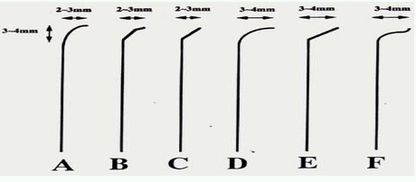 为了通过病变导丝尖端必须预先塑形,导丝尖端形状和导丝硬度同等重要。病变需要导丝有最合适的形状,使用不合适的导丝尖端形状通过病变是很困难的。在大血管中推送导丝需要尖端大的角度(图4 :D, E, F),而呈锐角的小血管需要导丝尖端小的角度(图4:A, B, C),就象常规PTCA中一样。