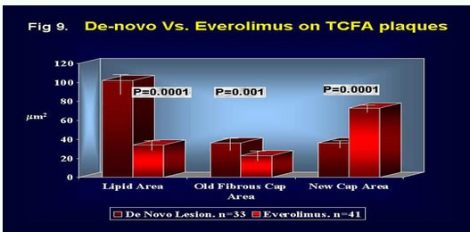 在金属支架中,支撑轨导致破裂的TCFA病变比没有破裂的病变有更高的新生内膜面积。但是在β-雌二醇药物洗脱支架和everolimus药物洗脱支架的TCFA病变中,无论支架是否导致了纤维帽的破裂都有相似的新生内膜面积。"在β-雌二醇药物洗脱支架支架组中支架导致纤维帽破裂的病变有轻度增高的新生内膜面积,但没有显著差异,而在everolimus药物洗脱支架组中这一差异更低,"Moreno博士说,"支撑轨数量少限制了这些结果,但是我们能猜测并认为使用药物洗脱支架能降低或调整支架金属支撑轨导致纤维帽破裂引起的损害。"