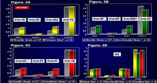 "当观察这些积分的严重性时,首先可以确定的信息是这些支架都是安全的,"Moreno说,"但是,即使积分较低,一些也有显著的差异。我们观察到了使用多聚物涂层或带有这两种不同药物的多聚物涂层和金属支架不同的愈合过程,这是药物还是多聚物涂层的原因呢?我们比较了多聚物涂层支架和其它两种带有药物的多聚物涂层支架,但没有发现显著性差异,这显示我们在血管愈合过程中所见到的轻度差异可能和多聚物涂层有关,而和所携带的药物无关。"