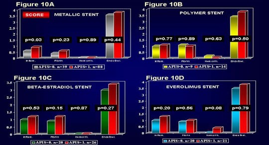 β-雌二醇药物洗脱支架病变有更高的炎症反应积分(P=0.05),更高的纤维蛋白沉积积分(P=0.0001)和较低的内皮化积分(P=0.04)。