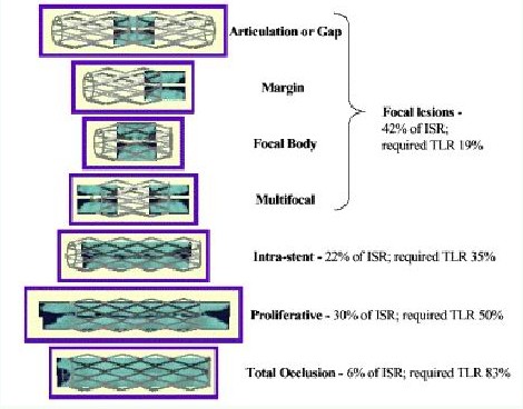 支架内再狭窄(ISR)病变根据再狭窄长度和支架长度分为4型:局限性(病变<10mm)、弥漫型(ISR病变位于支架内,长度>10mm)、增殖型(ISR病变延伸到支架外,长度>10mm)和阻塞性ISR。局限型又根据局限ISR病变和支架的关系分为A、B、C和D四种类型。