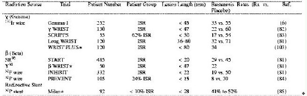 放射治疗(或者近距离放射治疗,该词来自于希腊语"brakhus",意思是短距离,指的是血管内放射源和靶细胞距离短)最近推荐用于ISR治疗,目前有很多这方面的临床试验和争论。血管内放射治疗被认为能损坏细胞DNA并有效区分内膜和中层细胞,该机制类似于肿瘤或非肿瘤性增殖型疾病的放射治疗。由于在ISR病变中有大量的平滑肌细胞增殖,这可以用免疫组化或增殖细胞核抗体(PCNA)和其它标志物测定出,因此人们对这种方法的有效性充满信心。