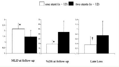 16例患者中15例术后取得了满意的造影结果,一例患者尽管采用了高压扩张(24个大气压)支架仍不能充分扩张,支架不能顺应球囊的扩张,最终QCA结果显示残余再狭窄34%,在随访期间该患者发生无症状性靶血管再闭塞。随访期间另一例患者发生59%和62%的直径再狭窄,而没有心肌缺血的证据。在第一例患者中。IVUS和冠状动脉造影分析揭示两个支架间有2.2mm空隙,该患者是心脏移植后患者并且支架远端有62%的直径狭窄。由于该患者心肌核素扫描没有心肌缺血证据,并没有再次行再血管化治疗。所有患者显示仅有轻度晚期管腔丧失,16例患者中的15例冠状动脉造影检查显示病变晚期丧失是10.67mm,11例患者实施了IVUS检查显示阻塞性新生内膜面积增加是2.6mm2。
