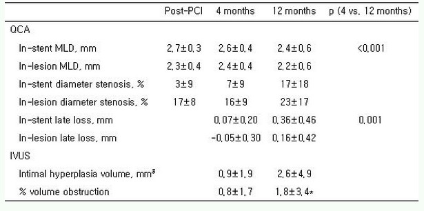 仅一例患者在12个月时发生无症状性、复发性ISR,该例患者未能行IVUS检查。所有患者1年后都没有心绞痛发作,在随访期间也没有再次再血管化治疗、支架内血栓形成或主要临床不良事件(脑血管事件、心肌梗死或死亡)。