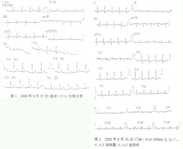 患者:男性,52岁,主因活动后气短20天,晕劂2次,于2000年8月29日由门诊收入院。患者于1个月前诊断为右下肢静脉炎,给予抗炎及口服中药治疗。近20天无明显诱因出现活动后气短,2天前上楼时出现头晕、周身乏力、晕劂,持续1分钟,就诊于急诊室,ECG正常(见图1)未予特殊处理。1天前再次出现晕劂,持续约10秒钟,伴大便失禁,次日到门诊就诊,心电图图示:不完全性右束支传导阻滞、SI QIITII、V1~V2导联T波倒置、V3~V4 T波双向(见图2)。胸片正常,以冠心病、不稳定心绞痛收入院。入院查体:BPll0/80mmHg,颈静脉充盈,肝颈回流征阴性。双肺呼吸音清,未闻干湿罗音。HRll5次/分,律齐,末闻杂音。入院诊断:PE。入院后急查血气:PH 7.48、PaO2 85.2mmHg、PaCO2 26.1mmHg、SaO2%97.4%、HCO3 l9.8mol/l。D-dimer>200Ug/m1。入院后即刻给予低分子肝素0.6ml皮下注射。入院后2小时患者突然出现劂、呼吸困难,血压0/0mmHg,HR 120次/分,立即给予多巴胺静脉点滴,气管插管,呼吸等治疗,1小时后抢救无效死亡。