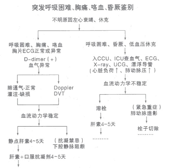 如有晕厥、低血压或休克者,应及时收住CCU或ICU,急查血气分析、ECG、床旁胸片及超声,观察有无肺动脉高压及右室扩大等。有条件者可行漂浮导管血流动力学监测,如肺动脉压升高而PWP正常者,综合分析后应得出高度疑似诊断,属于此类患者应尽快溶栓治疗,而后给予肝素及抗凝治疗。紧急重症可作肺动脉造影,取栓、经导管溶栓或栓子切除。血流动力学稳定者,可静点肝素或皮下低分子肝素,而后续用抗凝剂3~6个月,有下肢静脉血栓者或抗凝禁忌者,应行下肢静脉阻断(安置滤网等)。