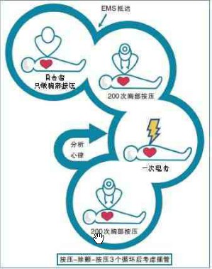 何谓心脑复苏? 心脑复苏(CCR)概念由美国亚利桑那大学萨维尔(Sarver)心脏中心复苏研究组的尤伊(Ewy)等于2003年提出,其方法包含连续胸部按压、新急救服务系统(EMS)和复苏后救治3部分(下表)。 2003-2007年,美国实施CCR的几个地区的结果表明,有目击者的院外心脏停搏(OHCA)和可除颤心律患者的生存率显著提高。与经典心肺复苏(CPR)相比,凯勒姆(Kellum)等研究显示,CCR可显著提高生存出院OHCA患者神经功能完好率(从15%至40%);博布罗(Bobrow)等发现CCR可使有目击者的心脏停搏和室颤患者的生存出院率提高300%(从4.7%至17.6%)。(详见本报5月21日C9版) CCR可显著提高生存患者的神经功能完好率,是CPR领域的重要进展。 1 连续胸部按压 CCR主张对院外心脏停搏(OHCA)患者进行连续胸部按压(CCC)而不做口对口通气(MMV)。尤伊等认为,由于目击者不愿实施MMV,以及MMV可导致胸部按压长时间中断、增加心内压而减少静脉回流、不能增加动脉血氧饱和度等原因,MMV可能降低原发性心脏停搏患者的生存机会。 2007年发表的3项临床试验均证实,实施CCC与传统CPR(胸部按压加通气)救治院外成人心脏停搏患者的生存率无显著差异。 由于OHCA最常见的病因是室颤(VF),对该类患者应立即行CCR,如现场配置有自动体外除颤器(AED)时,应力争在3~5 min内对患者进行一次电击除颤。 2 EMS新方案 早期除颤或采用胸部按压-除颤-胸部按压3步法 CCR中的EMS新方案是根据魏斯费尔德(Weisfeld)及贝克尔(Becker)倡导的室颤诱发心脏停搏(VF-CA)的三个时效性时期设计。 第一期为电活动期,持续约4~5 min,此期最主要的救治措施是除颤。根据这一构想,应在飞机上等公共场所配备AED装置,并鼓励公众应用,以及时挽救生命。 第二期为循环期,从4~5 min持续至15 min,此时纤维颤动的心肌已消耗了许多能量储备,因而应在除颤前或后立即进行胸部按压,通过胸部按压使脑及冠脉有足够血流灌注,这对神经功能的保护极为重要。应注意的是,在除颤前未行胸部按压而首先给予除颤常导致心脏停搏或无脉性电活动(PEA)。因此CCR推荐,在VF的循环期,应于除颤前先行200次胸部按压,以提供心肌灌注,并在除颤后立即再给予200次胸部按压,在胸部按压前不做脉搏或心律评估(图)。 第三期为代谢期,常始于发病10 min以后,目前几乎没有针对该期的有效治疗措施。 谨慎区分心脏停搏类型,采取不同救治措施 心脏停搏包含两种病理生理截然不同的类型,一种是原发性心脏停搏,其动脉血在心脏停搏时含氧量往往是充足的,另一种是继发于呼吸衰竭的心脏停搏,初期时心输出量正常,但由于没有通气而导致低氧血症、低血压及继发性心脏停搏。 对这两种不同的心脏停搏应采取不同的复苏措施,前者只需做胸部按压,而后者则应进行传统CPR(胸部按压加通气)。呼吸骤停常由于食物噎塞、淹溺、药物或酒精过量及呼吸系统疾病等引起。 住院期间发生的心脏停搏亦有所不同,大多数医院内VF-CA患者可在电活动期得到诊断和除颤。此外,医院内心脏停搏的CPR国家注册资料表明,大多数患者的病因为非心源性,对这些患者,通气和胸部按压均十分重要。 延迟气管插管和避免过度正压通气 EMS急救人员在进行复苏时面临的另一个重要问题是气管内插管。气管内插管可造成胸部按压较长时间中断,正压通气及通气过度也对患者有害,因此CCR不主张在VF-CA的电活动期及循环期进行气管内插管,而应延后进行。初期通气可采用被动注氧法。研究证实,VF-CA时正压通气的不良作用包括使胸内压增高,在胸部按压的放松期不能产生负性胸内压和抑制静脉回流至胸腔及左心,从而导致冠脉及脑血管压力下降。此外,过度通气及胸内压增高对颅内压及脑灌注压亦可产生不良影响。为避免正压通气和过度通气,CCR推荐用口咽气道装置,放置非再呼吸面罩及应用高流量(约10 L/min)氧以开通气道。这些均为被动注氧法。