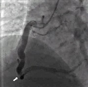 图2:例1冠状动脉造影显示右冠状动脉显著扩张,第二段与第三段反折处可见血栓影(箭头指示)