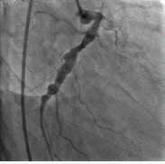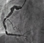 例2,男,40岁,以阵发性胸闷三年,加重一月入院。查体:心界扩大,心率74次/分,心尖区可闻及Ⅲ级收缩期杂音。心电图:V1~V4导联呈QS型,ST段抬高。冠状动脉造影示:LCX、RCA弥漫扩张,前向血流TIMIⅢ级;LAD开口100%闭塞。(图3,图4)。IVUS示:LCX、RCA显著扩张,未见明显动脉粥样硬化斑块。心脏彩超示:左心室前壁节段性运动减弱,心尖段室壁瘤形成;左心房内径39mm,左心室舒张末期前后径70mm;二尖瓣轻度关闭不全,三尖瓣轻度关闭不全;EF:41%。行冠状动脉搭桥手术(CABG)及室壁瘤切除术,术后随访4个月,无胸闷症状发生。