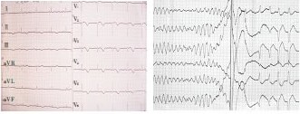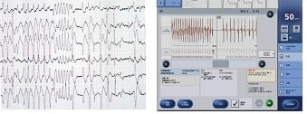 血电解质和心肌损伤标志物:正常。 治疗经过 患者入院后再次出现心悸,随后双上肢强直、抽搐、意识丧失达3~5分钟。心电监测结果显示,症状发作时心电活动为TPVT(图2),经心外按压可转复为窦性心律。
