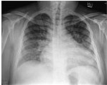 图1 胸部X光显示,心脏肥大及两侧肺血管充血。