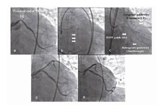 如果导引钢丝不能通过病变,而对侧侧支循环较好的情况下,可以试图经对侧侧支循环逆向通过闭塞远端通过病变,或者即使逆向导丝不能完全通过病变而通过双侧钢丝对吻技术也可完成介入治疗(图2),该方法又称为逆向钢丝对吻技术 (Retrograde wire kissing technique)。该技术通常选用直径大于1mm的侧支血管,在放置导引钢丝之前,应冠脉内给予硝酸甘油,然后选择亲水涂层导丝,小心通过侧支血管进入闭塞血管远端。必须指出的是因侧支血管血管壁较薄,导引钢丝操作不当则有可能发生血管穿孔。
