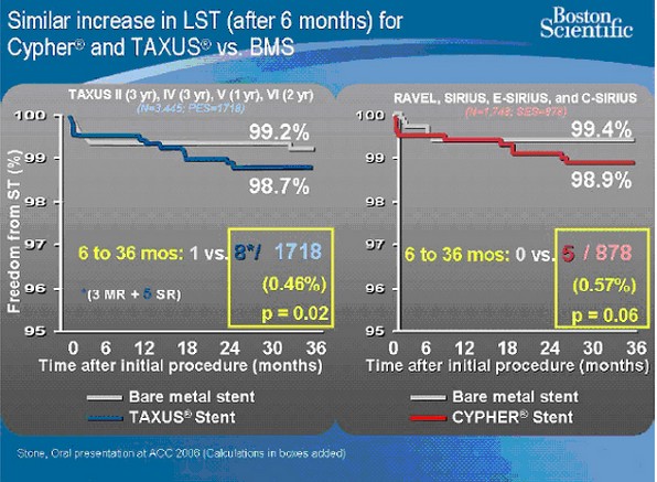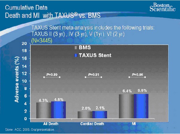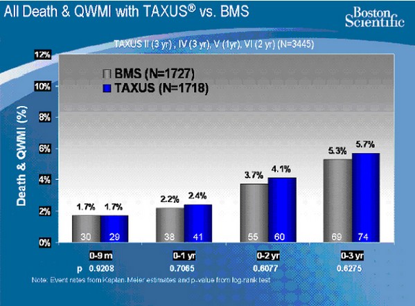 一个可能的解释是,TAXUS支架组6个月以上的迟发支架内血栓所导致的后果可能因为TAXUS支架降低再狭窄率,降低再次介入的风险(绝对风险降低10%),从而相应降低与之相关的死亡和心肌梗死所抵消。(见附件图3)根据Cleveland Clinic的资料,1186例金属裸支架再狭窄的患者中,9.5%表现为急性心肌梗死(Chen, Am Heart J, 2006; 151:1260)。