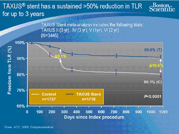 波士顿科学公司强烈支持FDA最近的声明。在该声明中指出“每年有数以千计的患者从药物支架中获益,免于因再狭窄而再次手术之苦”。特别要指出的是,我们的资料仍然显示,与金属裸支架相比,TAXUS药物支架具有更好的抗再狭窄效果,且同样安全(即不以增加死亡、心血管死亡或心肌梗死为代价),这一结果在近3,500名患者近3年的随访中得到验证。更重要的是,我们完全赞同最近FDA声明指出的“冠脉内药物支架当用于与生产厂商为获得FDA许可而进行的主要临床研究中相同的冠脉解剖条件的患者时,仍然是安全和有效的”。我们将继续密切监测TAXUS支架的长期风险/风险-效益问题。我们将继续向医生提供高透明度的临床研究资料,包括在即将举行的TCT会议上的演讲,通过TCTMD.com和theHeart.org网站发布。