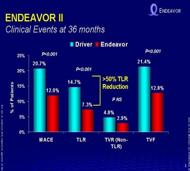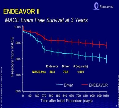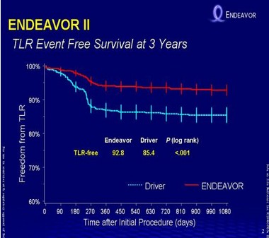 在为期三年的ENDEAVOR二期试验随访中,靶病变血运重建(TLR)发生率为7.3%,而Driver裸金属支架的对照组(p= <0.001)的发生率为14.7%,即再次介入的需求降低50%。在实验的主要终点靶血管失败率(TVF)方面,Endeavor是12.8%,比Driver的21.4%降低了40%(p= <0.001)。Endeavor3年期间的主要不良心脏事件发生率是12.0%,低于Driver的20.7%(p= <0.001),Endeavor的心脏死亡/心机梗塞(MI)发生率总计为4.5%,而Driver是6.7%(p=0.125)。3年中,Endeavor的死亡、心源性死亡和心肌梗塞发生率都比Driver要低。