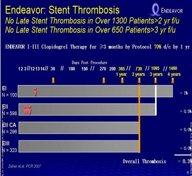Endeavor一期数据继续显示出卓越的长期效果,期间只有一例临床病例,是在试验第三年至第四年期间因癌症导致的非心源性死亡。4年的靶病变血运重建(TLR)发生率为3.1%,靶血管血运重建(TVR)的发生率为5.2%。实验的主要终点之一的主要不良心脏事件(MACE)的发生率是7.2%,在这批患者群中没有发生晚期支架血栓。