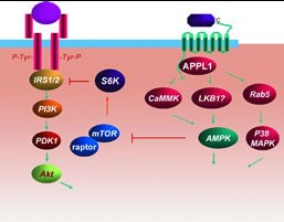 APPL1 APPL1与脂联素受体结合,激活脂联素下游效应分子,如AMPK和p38 MAPK,在脂联素的胰岛素增敏效应和促脂肪酸氧化中起重要作用。APPL1也可能直接与胰岛素受体及下游信号分子结合,增强胰岛素信号传导。