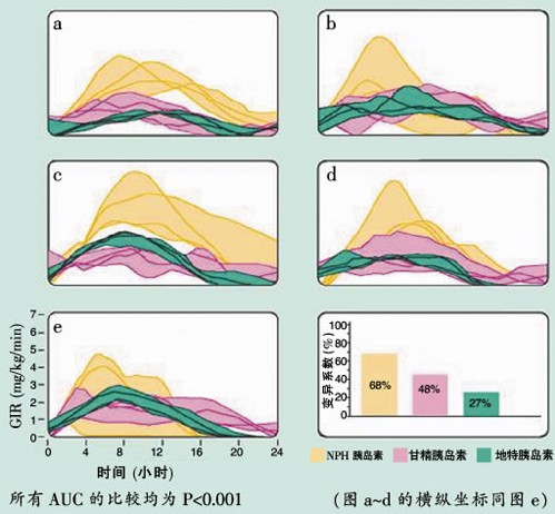 图1 比较24小时内葡萄糖输注率(GIR)曲线下面积的结果显示,与NPH和甘精胰岛素相比,地特胰岛素个体内变异较小