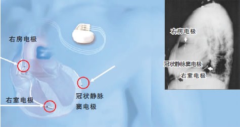 在右室与心脏冠状静脉窦心室支各置入一电极,通过调整两电极间的起搏间隙使双心室得到同步除极。