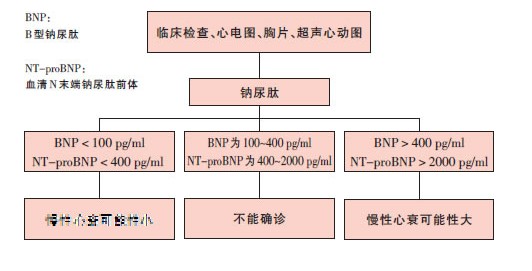● 该指南强调了B型钠尿肽/血清N末端钠尿肽前体(BNP/NT-proBNP)在心衰诊断、严重度危险分层,预后评估、监测或调整药物治疗、出入院决策中的价值,并列出应用上述指标诊断疑似心衰的流程图(图)。
