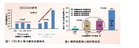 多项研究表明,CVD患者中伴有糖尿病者的死亡率显著高于糖代谢正常者。在亚洲进行的DECODA研究显示,CVD死亡率与负荷后(餐后)血糖高度相关,而与FPG无关(图1);STOP-NIDDM(阿卡波糖预防2型糖尿病)研究以阿卡波糖对IGT患者进行血糖干预,显著降低了心血管事件风险,提示控制餐后血糖可能对降低CVD患者的心血管事件或死亡风险具有重大意义。