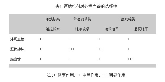 钙拮抗剂扩张冠状动脉,降低冠状动脉循环阻力,可用于治疗各种类型的心绞痛,尤其对冠状动脉痉挛引起的变异型心绞痛有显著疗效。不同种类的钙拮抗剂对各部位血管平滑肌的作用有明显差别,硝苯地平和非洛地平等对外周血管的作用最明显,尼莫地平和尼卡地平对脑血管作用最明显,对冠状动脉则以硝苯地平和地尔硫卓的作用最明显(表1)。