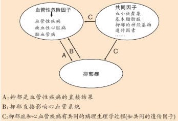 众多研究表明,血管危险因素或血管性疾病与抑郁症的发病密切相关。金(Kim)等对韩国社区中有血管性危险因素的老年患者进行调查发现,抑郁症的发生率随血管性危险因素的增加而增高。一项流行病学研究对6676例无卒中的抑郁病例进行了为期29年的随访,发现抑郁症状与卒中死亡率增加有关(危险度为1.66)。抑郁症和血管性疾病之间的联系是双向的,抑郁既可作为血管性疾病的后果,也可作为血管性疾病的危险因子(图1)。大量研究表明,冠心病、卒中、血管性痴呆均与抑郁症的高发病率相关,而抑郁是冠心病及卒中独立的危险因子。