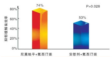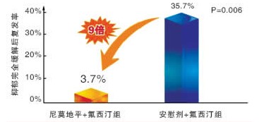 从血管性抑郁的发生机制来看,血管病变是其重要的影响因素。因此,从血管角度干预是一个新的治疗着眼点。研究发现,钙通道阻滞剂尼莫地平能使更多的血管性抑郁症状好转,并使复发比例下降。尼莫地平具有舒张血管和抗缺血(神经元保护)特性,可阻断继发于脑缺血后钙离子介导的神经毒性作用。2005年发表于《国际老年精神病学》杂志(Int Psychogeriatr)的多中心随机双盲安慰剂对照临床试验表明,PSD患者在使用常规剂量的选择性5羟色胺再吸收抑制剂(SSRI)的基础上加用尼莫地平,其症状缓解率高于使用安慰剂者,且抑郁症状缓解后的复发率也显著降低(图2、图3),提示对于血管性抑郁患者,在单纯抗抑郁治疗的同时干预血管病变能够进一步提高疗效。