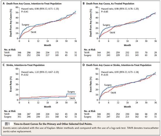 Craig R. Smith等2011年报道(The new England journal of medicine)以1年期死亡为终点的随机对照试验结果,美国及欧洲共25个中心对699例高风险AS患者(2007年5月至2009年8月),随机采取TAVR(348例,经股+经心尖)置入Edwards瓣膜系统对比外科换瓣(351例)。两组患者的基线情况无统计学意义差异,年龄(83.6±68 VS 84.5±6.4岁,P=0.07),STS score(11.8±3.3 VS 11.7±3.5,P=0.61),Logistic EuroSCORE(29.3±16.5 29.2±15.6,P=0.93)。1年期的全因死亡(84 例,24.2% VS 89例,26.8%,P=0.44)。1年期的心血管原因死亡(47例,14.3% VS 40例,13.0%,P= 0.63)。1年期比较,两组患者的心脏症状及6分钟步行情况均获得改善,两组间无统计学意义差异;超声随访的主动脉瓣跨瓣压差TAVR组比外科手术组略优(10.2±4.3 mm Hg VS. 11.5±5.4 mm Hg, P = 0.008);中重度瓣周漏在TAVR组明显更多(12.2% vs. 0.9%,P<0.001)。 该随机对照试验的1年期结论是:对高风险AS患者TAVR与外科手术的1年期生存率相仿。