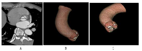 C:在图B基础上沿垂直左心室长轴切割,得到双斜位图C,主动脉三个瓣位于同一平面。