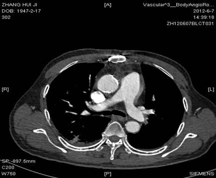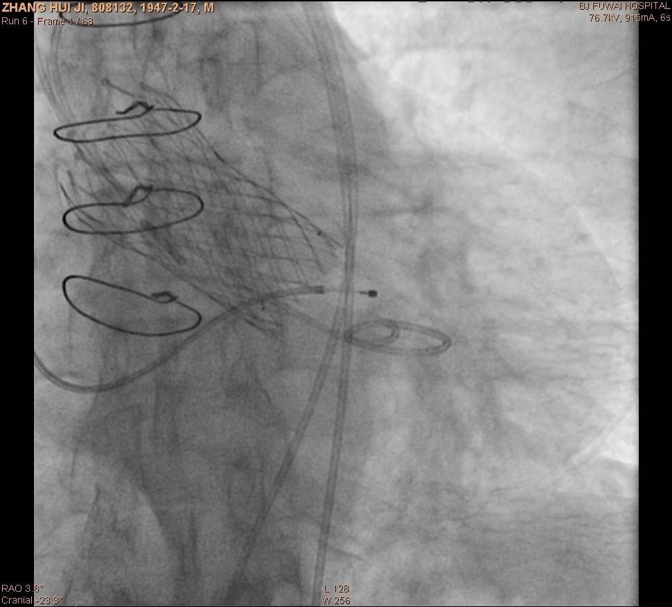 病例: 男性患者,65岁,2012年11月22日以“活动后胸闷、气短1年,加重5个月”入院。2012年5月曾入阜外医院外科住院,超声提示主动脉瓣重度狭窄,冠状动脉造影示LAD中段及D2 50-70%狭窄,OM1 近段80%狭窄,拟行主动脉瓣置换术,开胸后发现升主动脉僵硬、钙化,考虑瓷化主动脉,手术风险极高,停止手术,给予药物治疗。出院后患者日常活动仍有胸闷气短,症状逐渐加重,为行TAVR术再次入院就诊。既往高血压病史10年,糖尿病病史5年。入院查体:BP 130/90mmHg,神情,双肺呼吸音粗,可闻及湿性罗音,心率76次/分,主动脉瓣听诊区闻及IV/6级收缩期杂音。双下肢轻度浮肿。超声心动图示:左房前后径44mm,左室舒张末期前后径46mm,EF值66%,主动脉瓣瓣叶明显增厚、钙化,平均跨瓣压差49mmHg,超声诊断主动脉瓣病变,主动脉瓣重度狭窄伴少量返流,二尖瓣少量返流。诊断为:1、心脏瓣膜病,主动脉瓣重度狭窄、轻度关闭不全,心脏扩大,心功能III级;2、2型糖尿病;3、高血压病。入院后给予药物治疗控制症状,改善心功能,完善术前准备。签署知情同意书后于11月26日经股动脉途径行TAVR术。术后查体:BP120/80mmHg,双肺呼吸音粗,未闻及干湿性罗音, 心率86次/分,律齐,心音可,双下肢无水肿。术后心电图示:完全性左束支传导阻滞。超声心动图示:EF值64%,主动脉瓣人工瓣固定,瓣叶启闭无受限,少量瓣周返流,平均跨瓣压差约10mmHg,超声诊断TAVR术后,主动脉瓣人工瓣瓣周少量返流。给予拜阿司匹林、波立维等药物治疗。11月30日行永久起搏器置入术。术后随访2月,活动耐量明显增加,无不适。