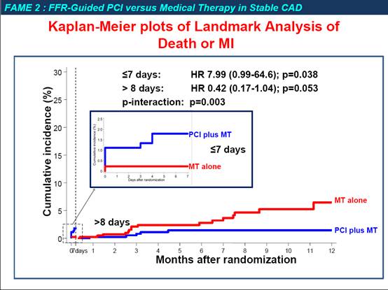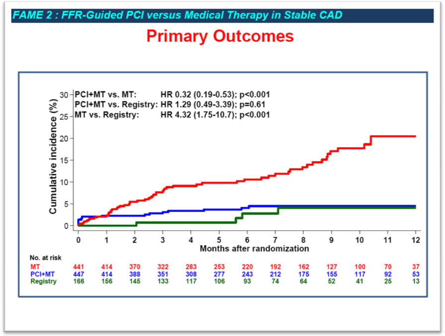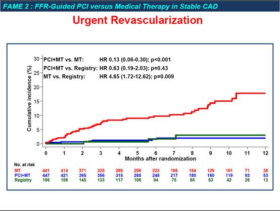 2012年8月26日,《新英格兰医学杂志》网络版刊登了FAME II(Fractional Flow Reserve Guided Percutaneous Coronary Intervention (PCI) Plus Optimal Medical Treatment (OMT) Verses OMT)研究结果,这一研究旨在讨论在FFR(Fractional Flow Reserve,冠脉血流储备分数)指导下,PCI对比药物治疗在稳定性冠心病患者中的治疗。这一研究是一项具有前瞻性的、随机的、有对照组的,国际多中心临床试验。