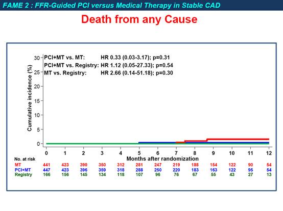 FAME II研究的主要终点曲线有三条(图1),图中显示了患者的复合事件发生率情况。可以看到,在随访的前12个月,复合事件发生率最高的是MT组患者。另外,早期时的PCI治疗组与注册组相比,事件发生率略高,但到1年期,二者发生率相同,因此PCI+MT组与注册组在复合事件发生率方面是没有显著差异的(p=0.61)。这一结果提示,对于存在单支、双支或者三支病变的稳定性冠心病患者,在FFR检测结果的指导下,使用DES置入+MT治疗效果很好。从任何原因死亡率(图2),心肌梗死率(图3),紧急血运重建发生率(图4)上看,PCI+MT组与注册组相比均无显著差别。
