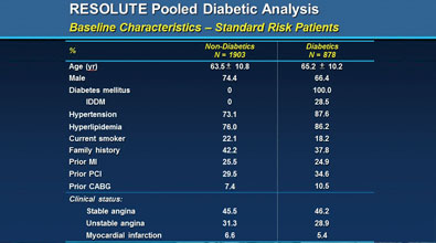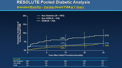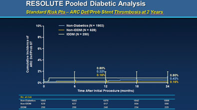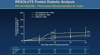 对5项关键的Resolute临床研究的5130例患者的数据进行的汇总分析显示,其中约1/3(1,535例)患有糖尿病。结果显示该支架在糖尿病患者中具有低事件率。2年对1500多例糖尿病患者随访显示再次血运重建率为5.8% ,血栓事件率仅为1.2% 。选取其中的878例标准糖尿病风险患者与文献中1302例置入第一代药物洗脱支架的糖尿病患者进行比较,结果显示:前者的12个月靶血管失败(定义为心脏性死亡、靶血管心肌梗死或靶血管血运重建)率为7.8%,显著低于后者(14.5%)。