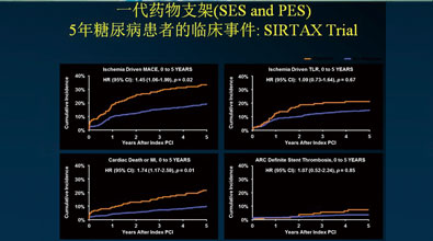 糖尿病患者介入手术后的临床预后往往不如非糖尿病患者,在第一代药物支架时代,糖尿病增加了PCI术后的靶血管重建率,而且随着病变长度的增加,再狭窄的发生率呈进行性增加。此外患者表现为更高的血栓事件,死亡率更高。SIRTAX随机对照研究随访五年,显示糖尿病组中MACE、TLR、心梗、心源性死亡及ARC定义的支架内血栓等心脏事件均高于非糖尿病组患者(图3)。其次新生病变的形成是糖尿病患者PCI术后远期心脏事件和再次介入治疗的重要原因之一。PRESTO研究发现,糖尿病患者9个月时新生病变的发病率(30%)明显高于非糖尿病患者(21%),可以预见随着时间的延长,糖尿病患者的新生病变的发病例将更加明显的高于非糖尿病患者。基于2009年发表的II型糖尿病旁路血管成形术血运重建调查(BARI 2D)试验结果,冠状动脉旁路移植术被认为是合并糖尿病的心脏病患者的更佳治疗选择(N. Engl. J. Med. 2009;360:2503-15)。