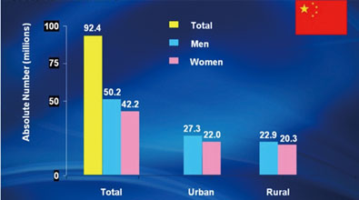 全球的糖尿病患者目前超过2亿,到2030年预计将达到3.6亿。在美国,大约一半的冠心病患者合并有糖尿病,冠心病是目前美国成人糖尿病患者最常见的死亡原因。而在中国,糖尿病患者超过9000万人(图1),糖尿病是继肿瘤,血管病后第三大严重威胁健康的疾病。我国有关心脏病相关调查显示,77%的CAD患者合并高血糖,其中糖尿病占53%,糖尿病前期占24%。