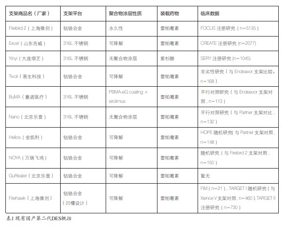 国产第一代DES 问世接近10 年,以Firebird 及Partner为代表,其主要结构为316L 不锈钢支架平台,应用永久性(不可降解)聚合物涂层材料装载雷帕霉素药物。早期的研究数据和临床应用结果均表明,第一代DES 在降低再狭窄发生及靶病变再次血运重建率方面疗效显著。但与早期国外产品(如Cypher,Taxus 支架等)一样,其永久存在的聚合物涂层可能会导致长期慢性炎症反应并增加极晚期支架血栓的发生风险。这也促使了国内DES 与时俱进的自我更新换代。