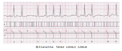 在上述基础上,结性心律常合并外出阻滞,房颤患者心电图呈现为短长周期交替出现,短周期相等,长周期相等,即结性心动过速出现3:2文氏外出阻滞。有时可出现6:5,4:3等传导,可见RR间期逐渐缩短,其之后出现的短周期仍然相等。