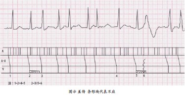房颤在一次长周期后可出现差异传导,常见为右束支阻滞型,此差异传导可能会出现蝉联现象。而连续出现宽大畸形的QRS波,暂时会误认为是一次短阵室速,如再次出现在长周期后短阵的宽大QRS波,可判定为蝉联现象。