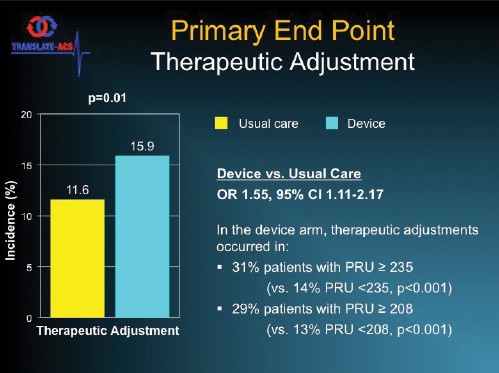 在1年时,正常/高反应组患者发生MACCE事件比例为8.6%,而调整治疗方案的低反应组为10.2%(P=NS)。Chevalier博士补充说在1年时两组间的大出血比例无差异。
