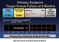 术后9个月临床随访,非劣效性主要终点TVF并未达标(Tryton双支架组17.4% vs. 即兴分支支架组12.8%;非劣效性P =0.417)(图2)。但在次要终点,9个月造影分支直径狭窄率方面,Tryton双支架组优于即兴分支支架组(31.6% vs. 38.6%;P =0.002)。事后亚组分析显示:在分支直径>2.25mm(41%的入选患者)亚组中,Tryton双支架术可以改善造影及临床结果,表现为比即兴分支支架组更低的靶血管失败率(11.3% vs. 15.6%)和分支节段内的直径狭窄率(30.4% vs. 40.6%,P =0.002)。需要说明的是该研究使用Medina分型来定义分叉病变,超过99%的病变都被各中心定义为真性分叉病变,但经过核心实验室确认,该比例在Tryton双支架组为89.9%,即兴分支支架组为86.2%。