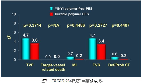 1年随访结果已于CIT2013上公布,结果显示:主要终点TVF两组间无显著性差异(P=0.3714),6个月后趋势线两者逐渐靠近,表明其有效性基本相同;次要终点TVR、血栓及复合安全性终点等指标均无显著性差异(图1)。作为中国首个无聚合物载药支架,上市6年来先后进行SERY、Freedom两个大型临床研究,两个研究中垠艺支架的各种数据表现基本一致,该结果进一步证明了具有长期安全优势的无聚合物药物支架,有效性值得信任。